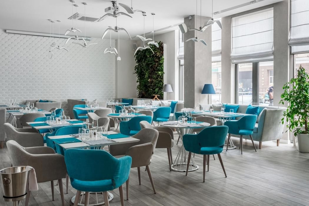 From the soft curve of a seashell to the shimmer of porcelain floors, the interiors reflect a gentle, maritime spirit. Creamy beige plaster walls, sheer drapery, ocean-blue accents, stone countertops, and warm wood tones create a calm, elevated setting. Guests arrive through a relaxed entry lounge, where soft couches and marine-inspired elements set a tranquil tone.